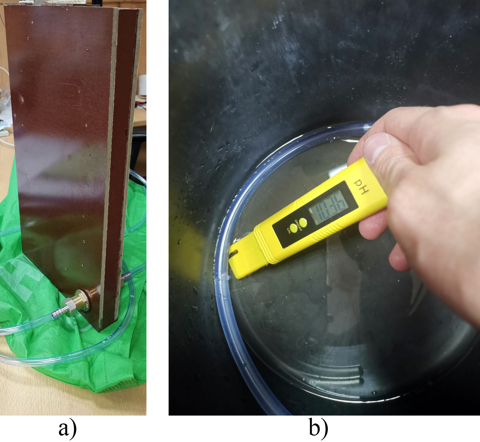 Fig. 1. Water electroactivation chamber of flow-type electroactivator: a) electroactivator; b) pH meter YIRYI EZ-9908