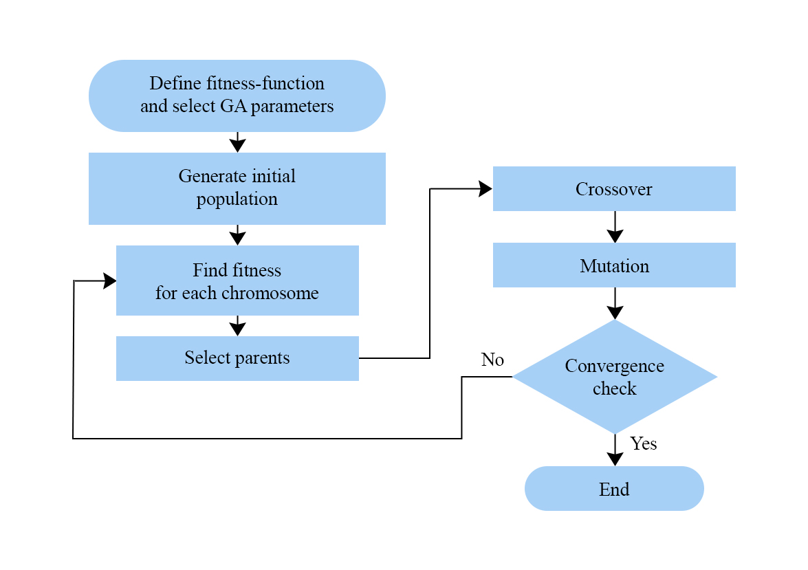 Genetic Algorithm. GA algorithm to attain the optimum parameters for the PI controllers gain of VR and CR. The GA is an optimization technique inspired by genetic principles and natural selection. The GA enables a population of several individuals to evolve under defined selection criteria to a state that optimizes “fitness” (i.e., minimizes the cost function). The Genetic Algorithm commences, identical to any other optimization technique, by establishing the optimization variables, the cost function, and the associated costs [23]. The flow chart of GA is shown in Figure 8.