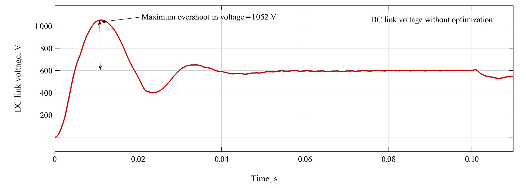DCL voltage without PI optimization. Figure 9 shows that the DCL voltage from conventional PI controller, as can be seen maximum overshoot recorded is 1 052 V and settling time is 0.07 s.