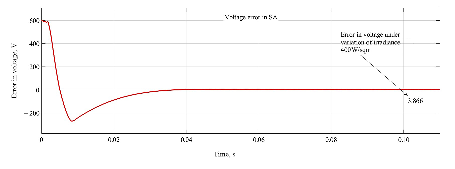 Minimization of error in DCL voltage with simulated annealing optimization. Solar insolation is varied as of 1 000 W/sqm to 400 W/sqm at t = 0.1 s. As illustrated from Figure 16 the errors reach around at t = 0.1 s is 3.866 V.
