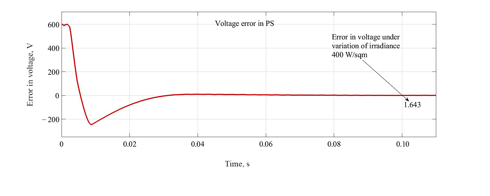 Solar insolation is varied as of 1 000 W/sqm to 400 W/sqm at t = 0.1 s. As illustrated from Figure 20 the errors reach around at t = 0.1 s is 0.6152 V.