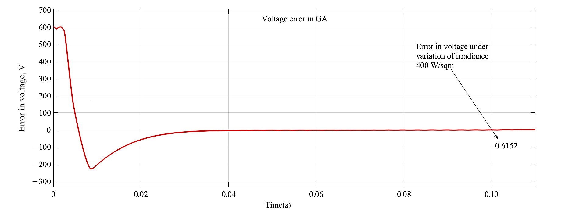 Minimization of error in DCL voltage with GA-SA optimization. Solar insolation is varied as of 1 000 W/sqm to 400 W/sqm at t = 0.1 s. As illustrated from Figure 12 the errors reach around at t = 0.1 s is 0.6090 V very close to zero.