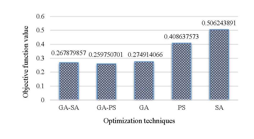 When evaluating a convergence curve in the optimization process, it is crucial to consider two key parameters: the convergence rate and the ultimate minimized or maximized value of the objective function. The first parameter determines the rate at which the convergence curve progresses, whereas the secondary parameter offers explicit insights on the value of the solution obtained through the optimization procedure. It is fairly clear in above figure that the GA-SA and GA-PS optimization techniques gets a suitable solution in minimizing the stated objective function with higher solution quality. The minimized value for the objective function for the GA-SA process is 0.267879857 and is obtained in the 32nd iteration of the simulation as well as the minimized value for the fitness function for the GA-PS process is 0.259750701 and is obtained in the 48th iteration of the simulation.