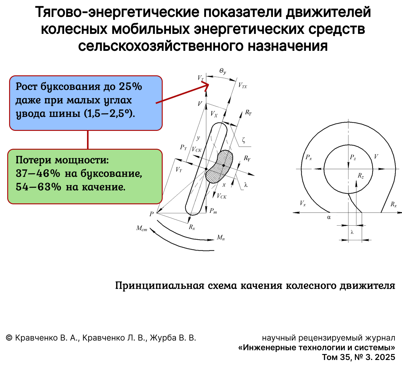 - Kravchenko V.A., Melikov I.M. Effect of the Tire Lateral Skid on Traction and Energy Performance of the Propulsion Unit in the Tractor of Class 5 Traction. Scientific Journal of KubGAU. 2021:170(6):211–222. (In Russ., abstract in Eng.) Available at: https://ej.kubagro.ru/2021/06/pdf/12.pdf (accessed 20.03.2025).