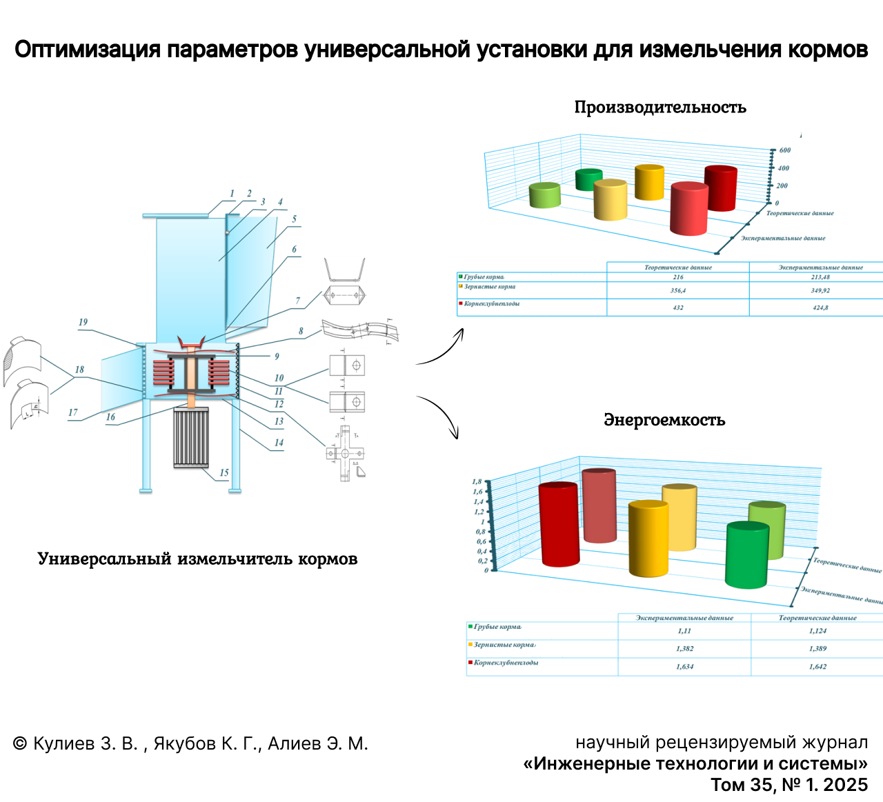 Разница между теоретическими и экспериментальными показателями по производительности для всех типов кормов составила 2 %, а по минимальному энергопотреблению для грубых стебельчатых кормов – 1,5 %, для зерновых и корнеклубнеплодов – 0,5 %. Эти результаты подтверждают, что теоретические исследования хорошо согласуются с экспериментальными данными и отражают реальные процессы, происходящие при измельчении кормов.
