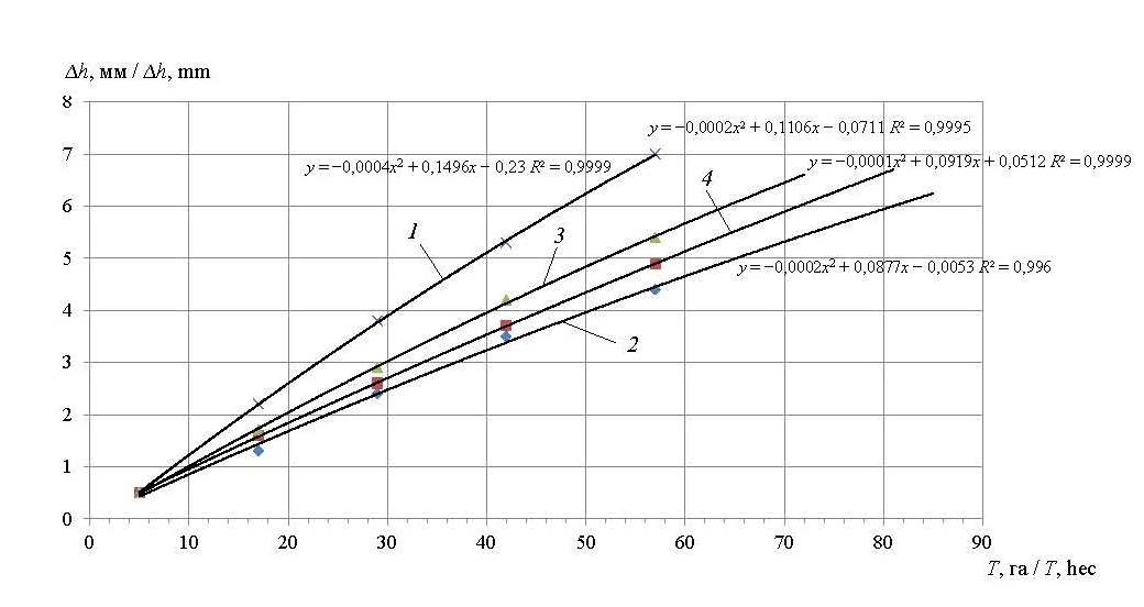 Результаты испытаний, представленные на рисунке 3, показали прямо пропорциональное увеличение износа ∆h от наработки Т. Это связано с однородностью механизма абразивного изнашивания независимо от способа упрочнения [15; 26].