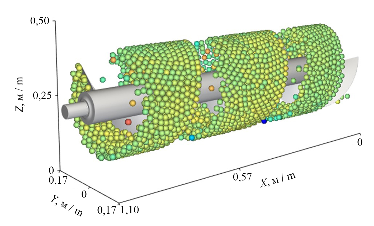 Для моделирования и исследования процесса перемещения сыпучей массы за основу был взят метод дискретно-элементного моделирования. Данный метод, разработанный Cundall и Strack в 1979 г. [32], позволяет моделировать поток отдельных частиц, имеющих свои собственные размерные характеристики и физико-механические свойства. При перемещении частиц во время моделирования учитываются нормальные и тангенциальные силы, силы гравитации, трения (как между отдельными частицами, так и между частицами и геометрией), имеющие теоретическое обоснование применения [33–35] и верифицированные с использованием лабораторного оборудования [36; 37]. Использование данного метода позволит определить координаты каждой частицы в заданный момент времени, с помощью которых можно построить траектории их перемещения и оценить во сколько раз реальная длина пути, пройденного частицей, отличается от линейной (оптимальной) длины пути в зависимости от свойств транспортируемой сыпучей среды. Коэффициент отношения полного пути, пройденного частицей, к пути вдоль оси шнека позволит оценить эффективность процесса транспортирования.