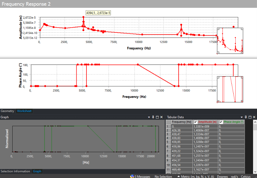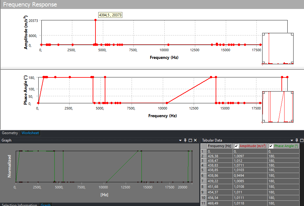 Следом рассмотрим график направленной деформации, построенный на основе данных гармонического анализа в ANSYS, иллюстрирующий зависимость амплитуды деформации зерна ячменя от частоты внешнего колебательного воздействия. На частоте 4 394 Гц наблюдается максимальное значение амплитуды деформации. Этот эффект является следствием резонансного усиления, при котором упругие свойства зерна ячменя и динамические параметры внешнего колебательного воздействия находятся в фазовом соответствии, что приводит к эффективному накоплению энергии в зерне ячменя.