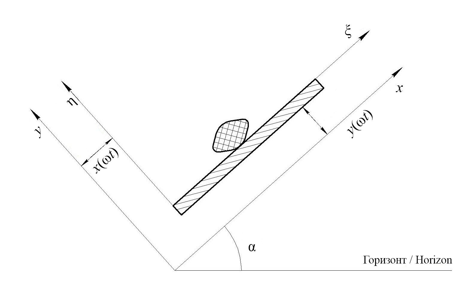 Возмущающую силу FВОЗМ выразим через ускорения наклонной поверхности, учитывая ее движение. Такой подход позволит связать характеристики колебаний основания с движением зерна ячменя [16]. Зададим продольные колебания загрузочного бункера бигармоническими, поперечные – гармоническими:
