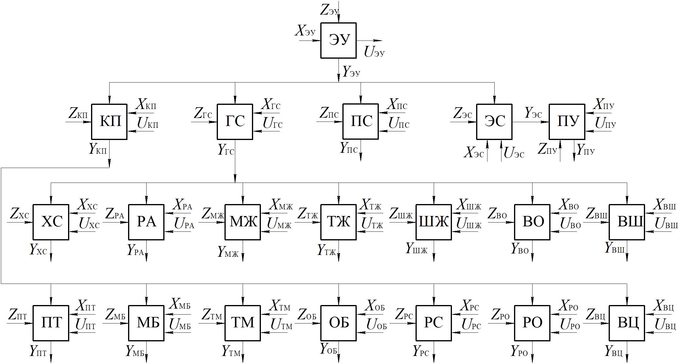Note: ЭУ – power plant; КП – countershaft; ПТ – receiving belt conveyor; МБ – threshing drum; ТМ – threshing machine belt conveyor; ОБ – impact beater; РС – flat-sieve straw walker; РО – cleaning sieve; ВЦ – cyclone fan; ГС – hydraulic system; ХС – chassis system; РА – cutting device; МЖ – header reel; ТЖ – header belt conveyor; ШЖ – header auger; ВО – cleaning fan; ВШ – unloading auger; ПС – pneumatic cleaning system; ЭС – electrical system; ПУ – control post; XЭУ , XКП, XПТ, XМБ, XТМ, XОБ, XРС, XРО, XВЦ, XГС, XХС, XРА, XМЖ, XТЖ, XШЖ, XВО, XВШ, XПС, XЭС, XПУ – function of external action on the corresponding functional element; ZЭУ , ZКП, ZПТ, ZМБ, ZТМ, ZОБ, ZРС, ZРО, ZВЦ, ZГС, ZХС, ZРА, ZМЖ, ZТЖ, ZШЖ, ZВО, ZВШ, ZПС, ZЭС, ZПУ – function of state of the corresponding functional element; UЭУ, UКП, UПТ, UМБ, UТМ, UОБ, UРС, UРО, UВЦ, UГС, UХС, UРА, UМЖ, UТЖ, UШЖ, UВО, UВШ, UПС, UЭС, UПУ – the function of control action on the corresponding functional element (control actions are performed automatically by the system or by the operator to ensure compliance with the requirements for the technological process); YЭУ , YКП, YПТ , YМБ, YТМ, YОБ, YРС, YРО, YВЦ, YГС, YХС, YРА, YМЖ, YТЖ, YШЖ, YВО, YВШ, YПС, YЭС, YПУ – the resulting parameters of the corresponding functional element.