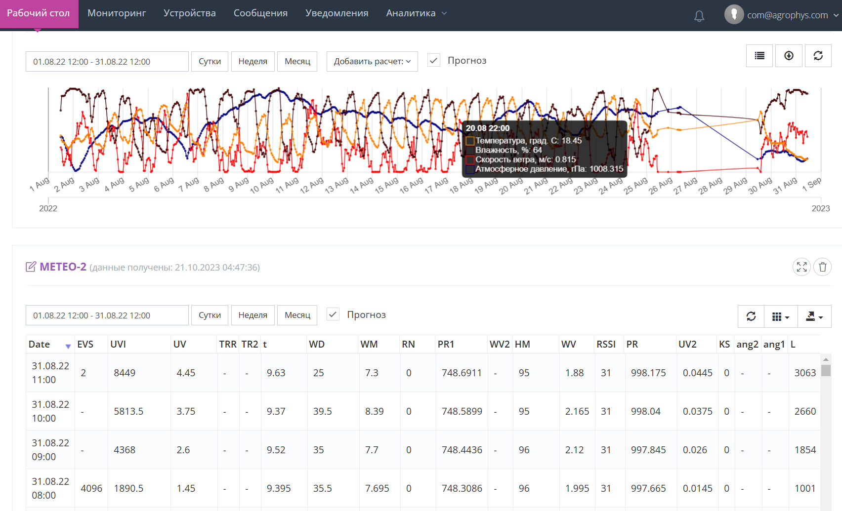 АМС из средней и высокой ценовой категорий обычно предоставляют доступ к данным через веб-сервисы, например, отечественный веб-сервис7 и зарубежное приложение8 [22], позволяющие видеть и загружать данные о динамике метеоусловий за выбранный период. Для примера презентационного отображения данных на рисунке 1 представлен дашборд сайта АМС «Сокол-М»9, которая использовалась на Меньковской опытной станции в 2022–2023 гг. (доступ к личному кабинету на сайте предоставляется при покупке хотя бы одного комплекта АМС). Сайт предоставлял данные в графическом (верхняя половина скриншота) и табличном виде (нижнее половина скриншота) за указанный период, предоставлялась возможность выбора конкретных метеопараметров на графиках (в данном случае температура и влажность воздуха, скорость ветра, давление).