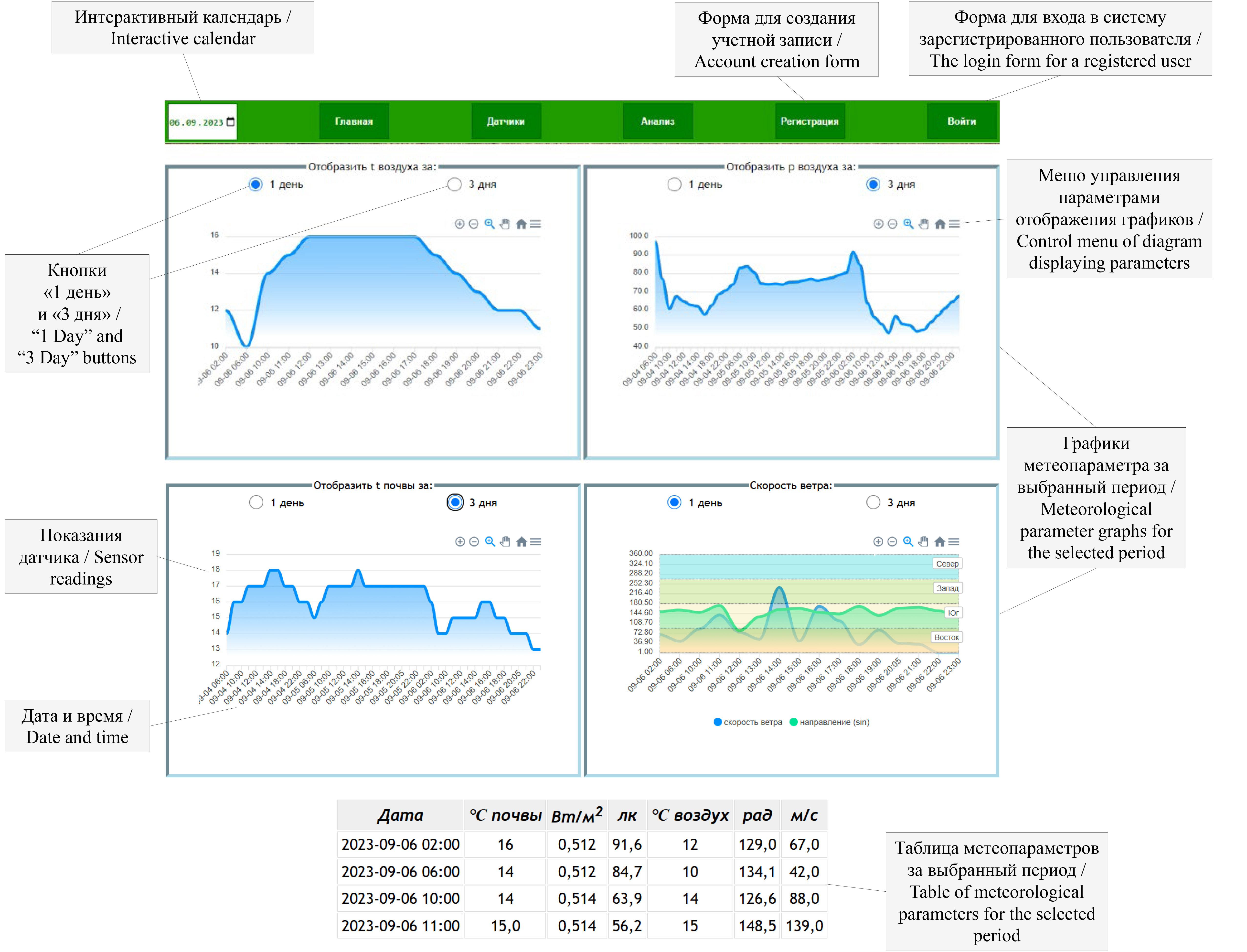 Введение. Внедрение автоматических метеостанций с применением технологий Интернета вещей (IoT) является новым этапом развития интеллектуального сельхозпроизводства. Современные веб-сервисы и приложения, использующие данные с IoT автоматических метеостанций обеспечивают пользователей репрезентативной информацией о климатических условиях в режиме реального времени, что способствует более эффективному планированию полевых работ и снижению рисков, связанных с изменением погодных условий. Важным аспектом получения и анализа актуальной метеорологической информации является разработка удобных для пользователей интерфейсов.
