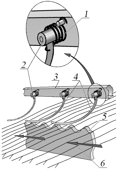Повысить качество расстила ленты стеблей льна и технологическую надежность одноременного УПР можно путем применения прижимного устройства (рис. 1), выполненного в виде прутков 4, расположенных на дополнительной балке 3 последовательно, друг за другом над всей боковой кромкой 5 расстилочного ремня 6, имеющей волнообразные выступы. При этом каждый прижимной пруток 4 независимо друг от друга присоединен передним концом к дополнительной балке 3 посредством шарнира 2 с возможностью подъема своей прижимной поверхности относительно рабочей поверхности 5 ремня 6 под воздействием перемещаемого слоя растений льна. Прижимная поверхность каждого прутка 4 имеет форму выпуклой кривой, а сила прижатия прутка 4 к рабочей поверхности 5 ремня 6 обеспечивается упругим элементом 1, например, пружиной кручения или резиновой пластиной.