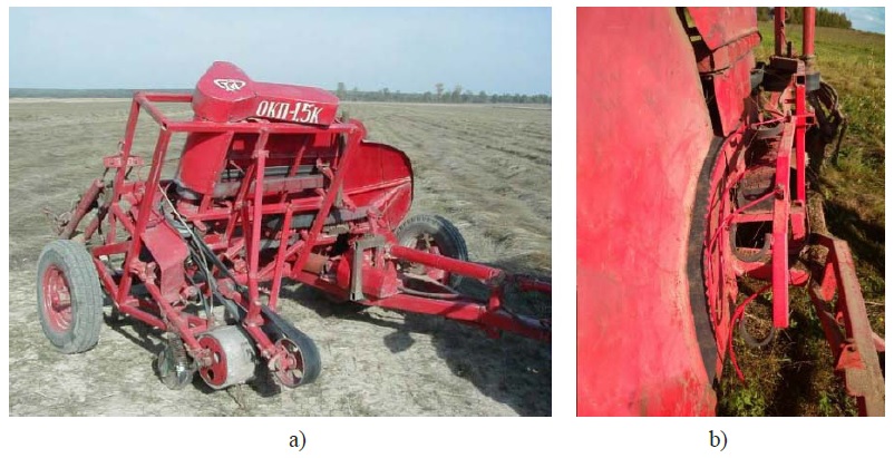Fig. 2. OKP-1.5K pick-up turner: а) front view; b) view of the device for controlled spreading