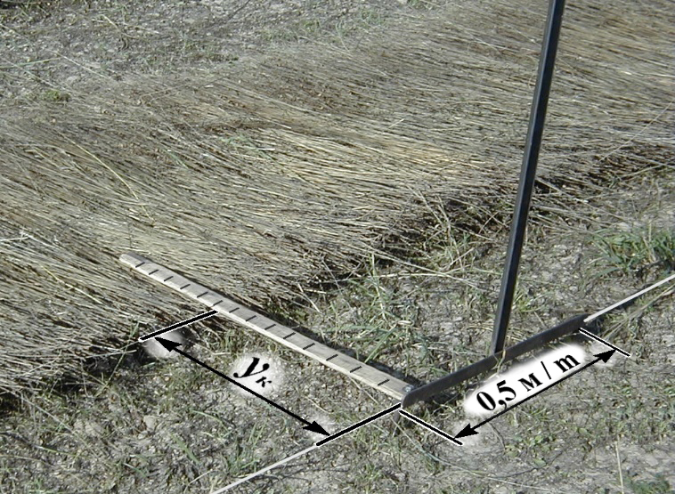Программа экспериментальных исследований предусматривала получение первичной информации в виде последовательностей числовых значений ординат yк расположения комлевых частей лент стеблей на поверхности поля относительно базовой линии. Замеры производили через каждые 0,5 м на отрезках ленты длиной 25 м в пятикратной повторности. Таким образом, суммарная длина реализации в каждом варианте составила 125 м, то есть 250 значений yк. Для регистрации ординат yк использовали нестандартное приспособление (рис. 3), позволяющее производить замеры с заданным шагом. Длина реализаций и шаг дискретизации выбраны на основании предварительных сведений об изучаемом предмете исследования[5] [7; 17].