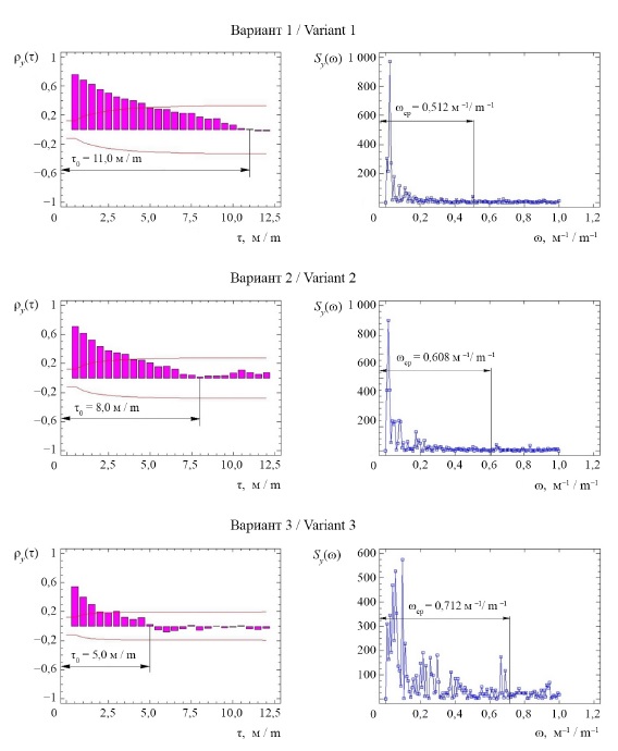 Обработку полученных числовых рядов производили методами математической статистики и корреляционно-спектрального анализа с помощью компьютерной программы STATGRAPHICS Plus 5.0 и табличного редактора Microsoft Excel. Вычисляли математические ожидания – my, средние квадратические отклонения – σy и коэффициенты вариации – Vy6. Для описания внутренней структуры изучаемых процессов в пространственной (по длине ленты) и частотной областях применяли корреляционно-спектральный анализ с построением графиков нормированных корреляционных функций – ρy(τ) и спектральных плотностей – Sy(ɷ). Далее анализировали в каждом варианте время спада корреляционной функции (интервал корреляции) t0 и ширину полосы основных частот ɷср. Для оценки степени сохранения прямолинейности обернутых лент по отношению к базовому варианту использовали условный коэффициент, представляющий собой частное от деления интервалов корреляции: