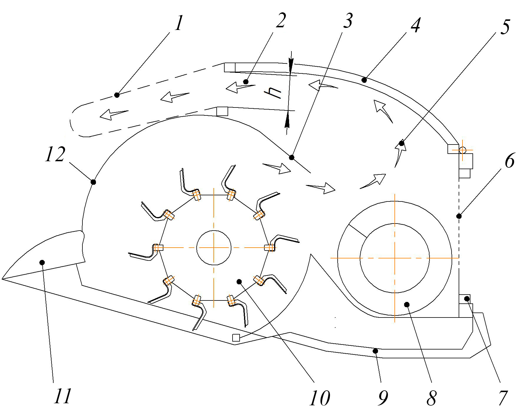 Очесывающая жатка «Озон» была соответствующим образом модернизирована для достижения цели исследования (рис. 1). У одной из трех ее секций сетчатая стенка 6 была заменена на сплошную. При этом между обтекателем 12 и крышкой 4 осталась продольная щель для выхода воздуха и захваченного им мелкого вороха, ширина которой h могла регулироваться посредством цилиндрических шарниров крепления крышек 4 к корпусу 7 и кронштейнов с отверстиями. Для улавливания мелкого вороха по контуру щели закрепляли мягкий сетчатый контейнер (мешок) 1. Генерируемый очесывающим рабочим органом 10 воздушный поток, миновав внутренний щиток 3 над шнеком 8, оказался в радикально расширившимся воздушном канале, вследствие чего потерял скорость и тяжелые компоненты, в том числе свободное зерно, которое шнек 8 подавал в наклонную камеру вместе с недомолоченными колосьями и кусками соломы. Задняя стенка корпуса жатки комбинированная. Часть ее поверхности затянута сеткой 6, которая может быть перекрыта сплошным щитком. Таким образом, параметры воздушного потока можно дополнительно регулировать.