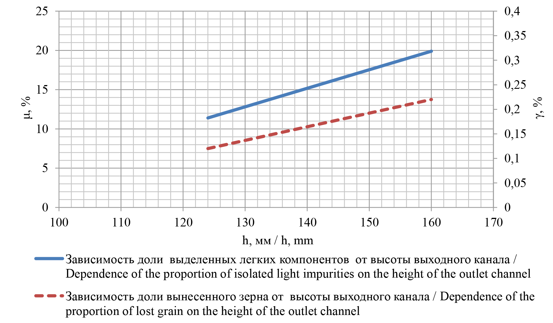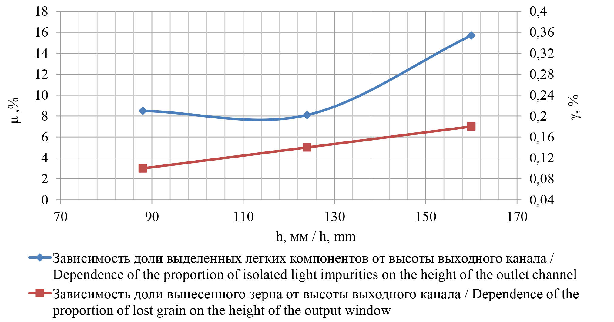 Анализируя результаты, полученные при закрытии сетчатых окон, целесообразно выделить значение высоты выходного канала h = 88 мм. Данному размеру соответствуют минимальные потери зерна γ = 0,1 % и доля выделенных компонентов мелкого вороха, равная μ = 8,5 %. Увеличение высоты выходного канала до 160 мм приводит к значительному повышению доли выделенных легких компонентов (до 16 %), при этом заметно растут и потери зерна.