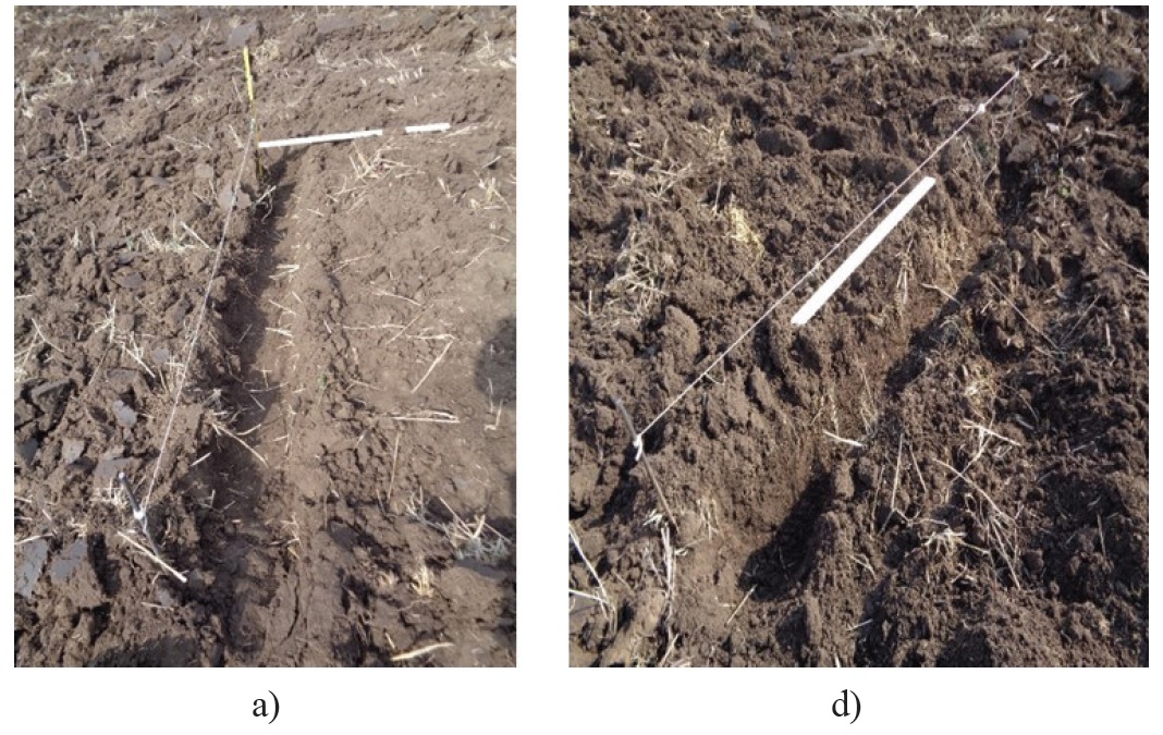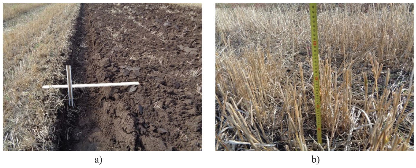 По методике экспериментальных исследований определяли глубину вспашки (рис. 3а) и среднюю высоту растительных и пожнивных остатков на поле (рис. 3b), измерения проводились на пяти участках учетных делянок, расположенных по диагонали загона. Количество стерни и растительных остатков подсчитывали и производили по 10 измерений с погрешностью ± 0,5 см.