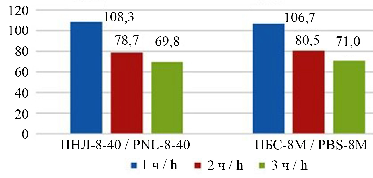 Показатели водопроницаемости почвы в этих периодах у плуга ПНЛ-8-40 несколько выше (рис. 7). За первый час водопроницаемость в обработанном ПНЛ-8-40 пласте после первой культивации составила на 5,7 % больше, чем после обработки почвы плугом ПБС-8М. Перед посевом озимой пшеницы значения показателей практически выравнивались (рис. 8).