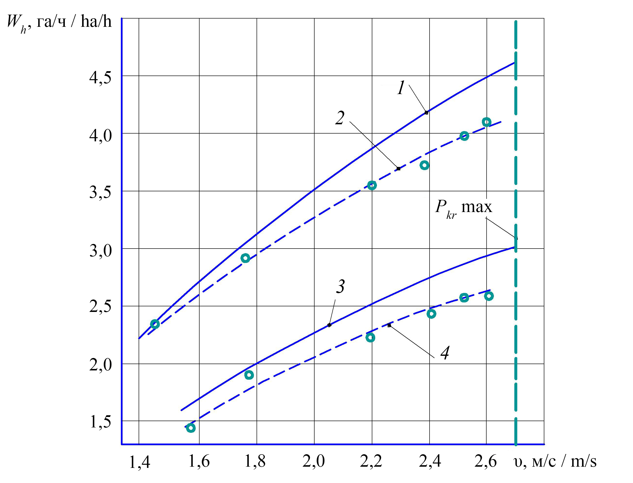 Расчет зависимости часовой производительности Wh от скорости движения агрегата определяли по выражению: