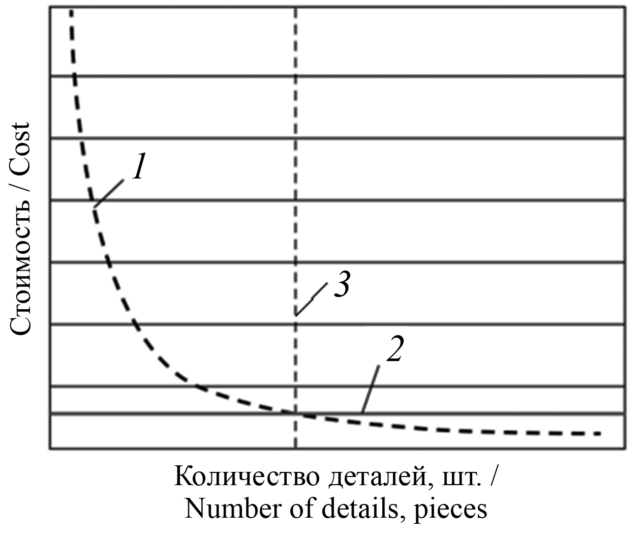 1 – традиционная технология; 2 – аддитивная технология; 3 – рентабельность аддитивного производства
