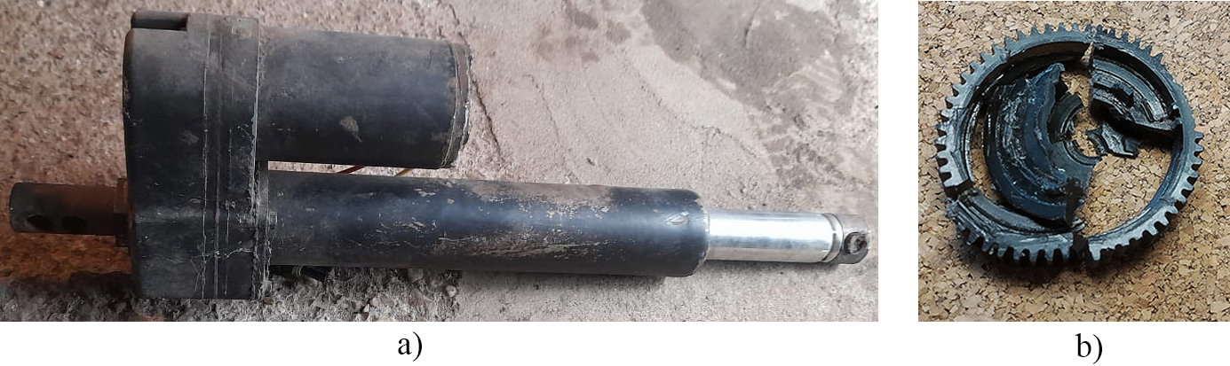 a) электрический линейный привод подбарабанья зерноуборочного комбаина; b) разрушенное зубчатое колесо привода