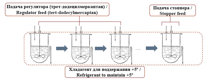 Апробация созданной методологии осуществлялась на реальном производстве. Соотношение бутадиена со стиролом в мономерной фазе по массовым частям составляет 70:30. Для регулирования молекулярной массы применяется трет-додецичный меркаптан, многоточечная подача которого возможна в соответствии с аппаратурным оформлением производства (рис. 2). Массовое соотношение воды к мономерам составляет 220:100. Для прекращения роста конверсии в качестве стоппера применяется диэтилгидроксиламин, который аппаратно вводится в конечный полимеризатор батареи.