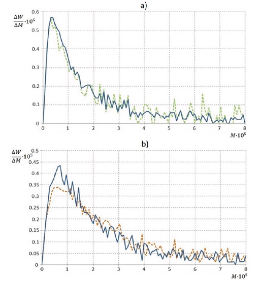 Проведение вычислительного эксперимента для условий трехточечного регулирования позволило также добиться соответствия расчетных и экспериментальных данных. Вызывают интерес сравнение кривых, характеризующих распределение макромолекул по массе, полученные в рамках реализации статистического подхода согласно этапам 4–6. На рисунке 5 представлена визуализация дифференциальной кривой молекулярно-массового распределения для условий двухточечной и трехточечной подачи регулятора. Анализ кривых позволяет сделать вывод о том, что добавление третьей точки подачи регулятора способствует снижению среднемассовой молекулярной массы сополимера, при этом распределение характеризуется увеличением доли низкомолекулярных фракций и уменьшением доли высокомолекулярных фракций.
