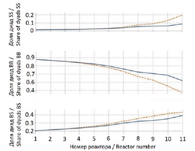 Discussion and Conclusion. The analysis of the molecular chain structure of the copolymerization product under conditions of adding the third control point characterizes the decrease in rigidity and increase in elasticity of the resulting product, and the created digital evaluation tools allow by means of computational experiments to select optimal parameters of the regulator feeding in order to obtain polymers with a given molecular mass.