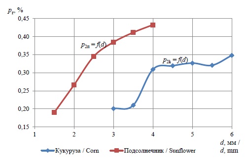 Из данных таблицы 2 видно, что экспериментальное исследование было проведено с достаточно высокой точностью – практически на всех этапах относительная ошибка опыта не превысила 5 %. При этом для анализа наибольший интерес представляет показатель частости групповых подач рг, который определяется как отношения количества наблюдаемых в опыте групповых подач к общему количеству подач. В графическом виде зависимости частостей групповых подач семян подсолнечника и кукурузы от диаметра присасывающих отверстий представлены на рисунке 4.