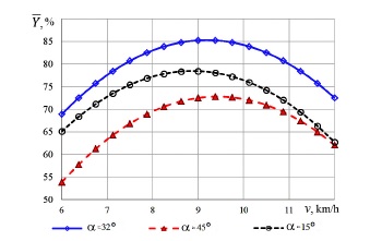 Dependences (Fig. 7) of the tillage quality Ῡ on the motion speed v were obtained by approximation for different rotation angles of disks: