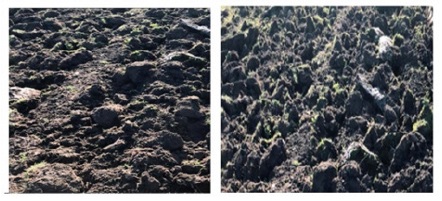 The nature of the isolines obtained as a result of the section of the response surface Ῡ (Fig. 7), shows that the motion speed v has a greater impact on the quality of tillage than the disk approach angle α. The same conclusion confirms the smaller absolute value of the coefficient of the second factor x2 canonical equation (4). The appearance of the treated soil in the experimental area of the field is shown in Fig. 9.