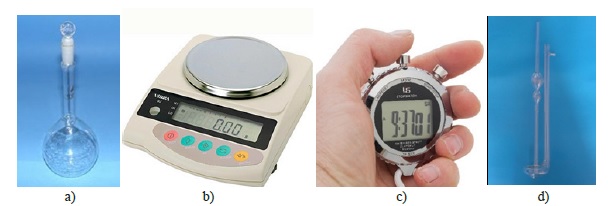 b) laboratory scales VIBRAAJH-620CE; c) electronic stopwatch; d) viscometer VPZh-2