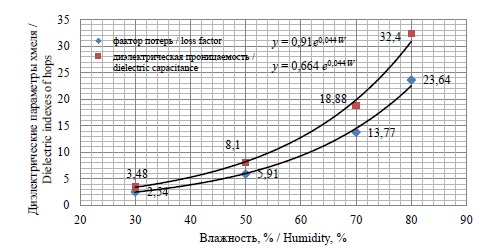 На рисунке 1 представлены зависимости диэлектрических параметров хмеля от влажности, рассчитанные по выражениям (2).