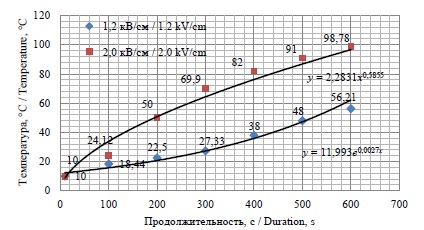 Fig. 2. Dynamics of hop heating at different EF intensities: 1.2 kV/cm; 2.0 kV/cm