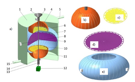 a) general view in section; b) upper perforated hemisphere; c) non-ferromagnetic it can be aluminum, copper, gold) perforated disk;