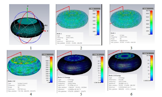 3 − magnetic field strength, A/m; 4 ‒ surface current, A/m; 5 − radiation energy of electric component, W/m3;