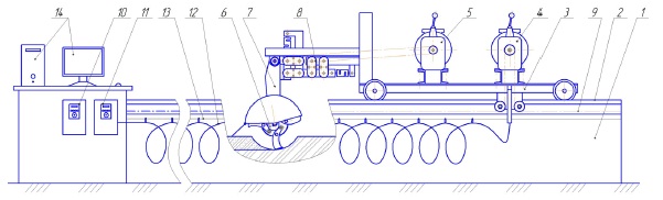 Для решения сформулированных выше задач на базе Института механики и энергетики МГУ им. Н. П. Огарёва разработан и изготовлен экспериментально-измерительный комплекс «Почвенный канал» (рис. 3), представляющий собой почвенный канал 1, в верхней части которого закреплен рельсовый путь 2. По нему перемещается подвижный модуль 3 с установленными на нем электрическими приводом перемещения модуля 4 и приводом 5 испытуемых активных рабочих органов (АРО) 6 почвообрабатывающих машин, установленных на приводных валах цепного редуктора 7. Цепной редуктор 7 закреплен на динамометрическом модуле 8, зафиксированном на подвижном модуле 3. Перемещение подвижного модуля 3 осуществляется при помощи привода 4 и цепи 9, закрепленной на почвенном канале 1. Управление двигателями привода 4 подвижного модуля 3 и приводом 5 испытуемых АРО 6 обеспечивается от преобразователей частоты 10 и 11 через питающий электрический кабель 12, подвешенный на стальном тросе 13. Сигнал с датчиков модуля 8 поступает на автоматизированный измерительный комплекс 14 с последующей обработкой.