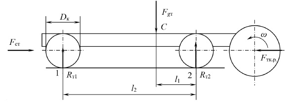 где Fgт – сила тяжести тележки, Н; l1 и l2 – расстояние от центра масс до оси задних колес и колесной базы модуля соответственно, мм; l1 = 300 мм и l2 = 1 100 мм.