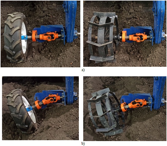 7. Fig. 6. Removable module for the study of traction force on the driving wheels of small mechanization vehicles: a) the position of the subjects of the pneumatic wheel and the wheel with metal ground hooks at the angle of inclination of the axes of their rotation equal to α = 0°; b) the position of the subjects of the pneumatic wheel and the wheel with metal ground hooks at the angle of inclination of the axes of their rotation equal to α = 28°
