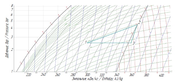 Далее из термодинамического цикла для конкретного рабочего вещества (рис.1) находим удельную работу сжатия мембранного насоса и рассчитываем расход теплоносителя, кг/с: