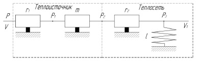 Для получения дифференциальных уравнений гидравлического контура теплоисточника и теплопотребляющей установки (тепловой сети) использовали энергетическую цепь (рис. 3), включающую в себя два звена: первое звено гидравлическое (учитывает потери в теплоисточнике с помощью активного сопротивления r1 и массу теплоносителя m); второе звено гидравлическое (учитывает потери на трение в теплосети с помощью активного сопротивления r2 и демпфирующие свойства теплосети с мембранным насосом податливостью l).