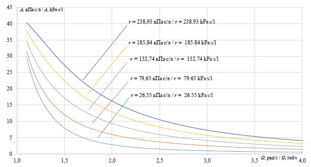 Из приведенного графика видно, что с увеличением гидравлического сопротивления тепловой сети располагаемое давление мембранного насоса на теплоисточнике должно быть выше. С увеличением расхода теплоносителя (с ростом частоты пульсаций) происходит снижение давления из-за эффекта демпфирования колебаний самой динамической системы. Данный график позволяет определить, каким должно быть минимальное давление на теплоисточнике в зависимости от изменения расхода теплоносителя и активного гидравлического сопротивления тепловой сети.