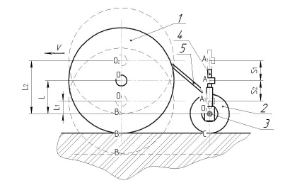 Возмущением G, действующим на объект управления, является изменение расстояния L между осью O вращения колеса 1 энергетического средства привода почвообрабатывающей машины и осью вращения O3 опорных колес 2 машины для обработки почвы. Изменение расстояния L в большую L2 или меньшую L1 сторону компенсируется перемещением штока актуатора из точки А в точку A2 или A1 на расстояние S2 или S1 соответственно. При обработке для поддержания профилированной (выровненной) предпосевной/предпосадочной подготовки почвы должно соблюдаться условие