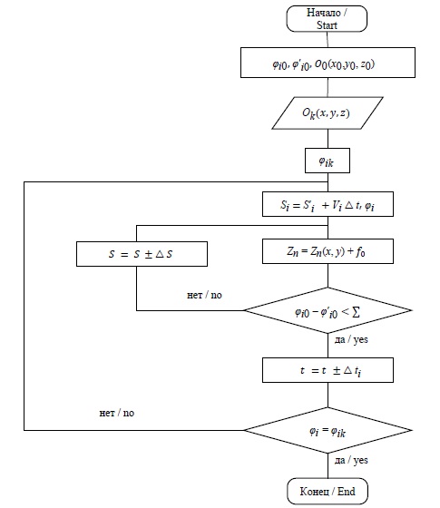 Алгоритм формирования программы управления линейными актуаторами регулирования глубины хода рабочих органов построен из условия идеального отслеживания траектории О0О1О2 (рис. 2).