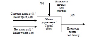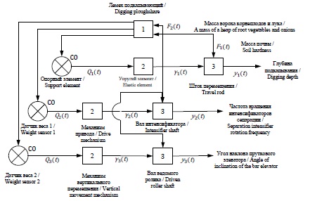 В каждый момент времени происходит изменение возмущающего воздействия F2(t) (массы вороха лука), которое воспринимается измерительным органом (ИО) (датчик веса) 1 и передается на сравнивающий орган – блок управления (БУ). Если измеряемая величина больше определенного значения, то сигнал поступает на рабочий орган (РО) (механизм вертикального перемещения) 2 и передается на объект управления (ОУ) (вал ведомого ролика и вал интенсификатора) 3, изменяющий управляемую величину y2(t) и y3(t) (рис. 8).