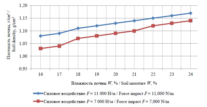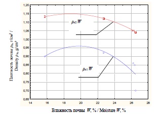 Графическая интерпретация функциональной зависимости плотности до ρп1 и после ρп2 воздействия прикатывающих катков от влажности почвы представлена на рисунке 7.