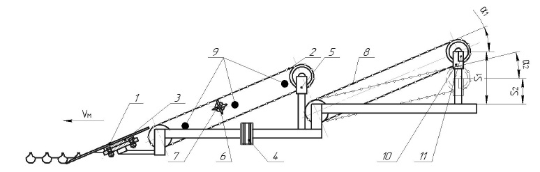 1 – лемех подкапывающий; 2, 8 – прутковый элеватор; 3 – датчик веса подкапывающего лемеха;