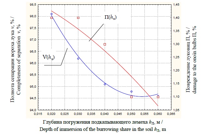 Результаты статистической обработки экспериментальных исследований качества уборки лука позволили получить графические зависимости полноты сепарации вороха лука ν и повреждений луковиц П от исследуемых параметров при получении аналитической зависимости